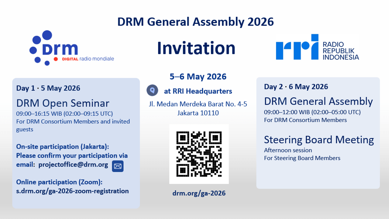 - May 5th is an open, VIP General Assembly and seminar (0900-1600 local time). Key Indonesian specialists (from RRI, the Ministry KOMDIGI, the emergency agency, private broadcasters and manufacturers will take part in the event. Demonstrations of new receiver solutions and dual-standard receivers will be shown for the first time. You can attend in person or on zoom registering at: s.drm.org/ga-2026-zoom-registration