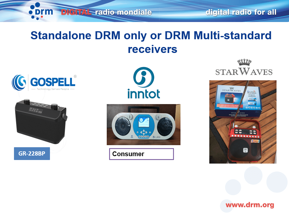 DRM-compatible receivers were a main topic of the presentation. Gospell and Inntot companies promoted a variety of receivers and solutions for standalone and car. Starwaves highlighted the Tuk-Tuk receiver and launched its new receiver W293BT demonstrating excellent DRM in shortwave reception. RF2digital showcased their multi-standard SDR option. Other information came from Cambridge Consultants regarding new developments on low-cost, low-energy receivers and from Avion.