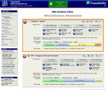 The Fraunhofer DRM ContentServer™ R8 Technology is a flexible and highly reliable professional broadcasting solution for DRM (Digital Radio Mondiale). It combines internal audio encoding, support for remote audio encoders, multimedia data management and multiplex generation. A convenient and user-friendly web interface enables configuration and system monitoring via remote access (ContentServer-as-a-Service concept).