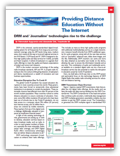 In the Fourth Quarter Broadcast Technology publication published by the IEEE, Thimmaiah Kuppanda and Alexander Zink, Fraunhofer IIs, explain how DRM and Journline technologies rise to the challenge of providing distance learning solutions where there is no internet availability.