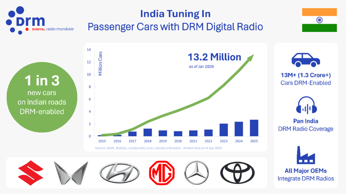 As recently announced by the DRM Consortium, India has seen a remarkable and most successful deployment of cars with DRM receivers within a very short time, only since 2017